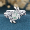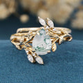 Nature Inspired Pear cut Moss Agate Leaf Gold ring set