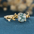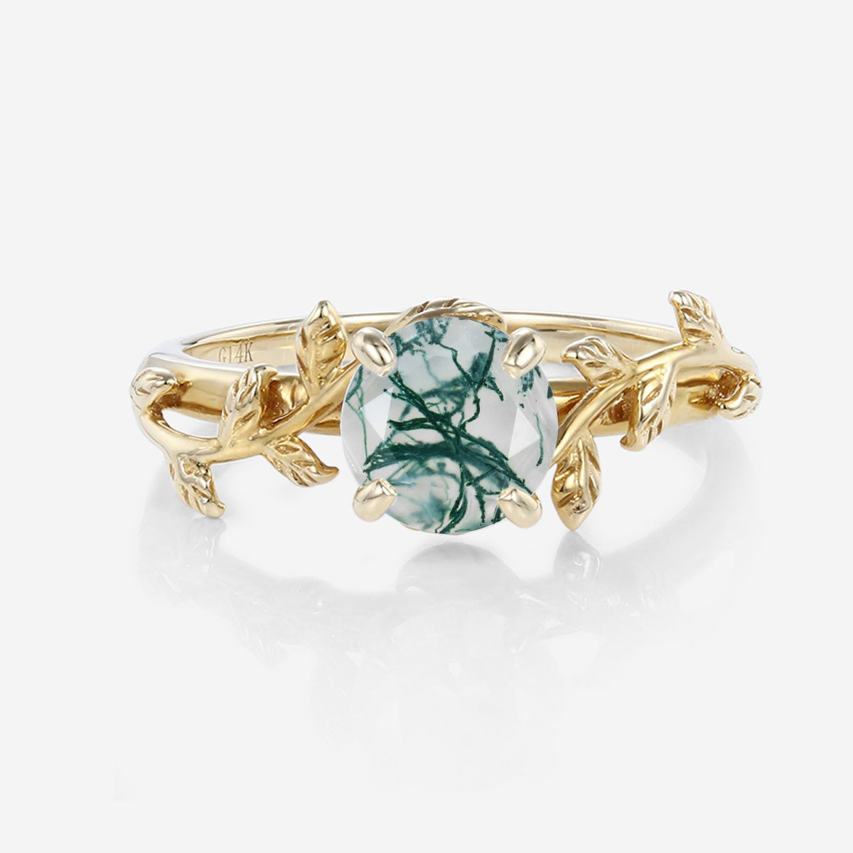 Nature Inspired Round cut Moss Agate Leaf Gold Engagement Ring
