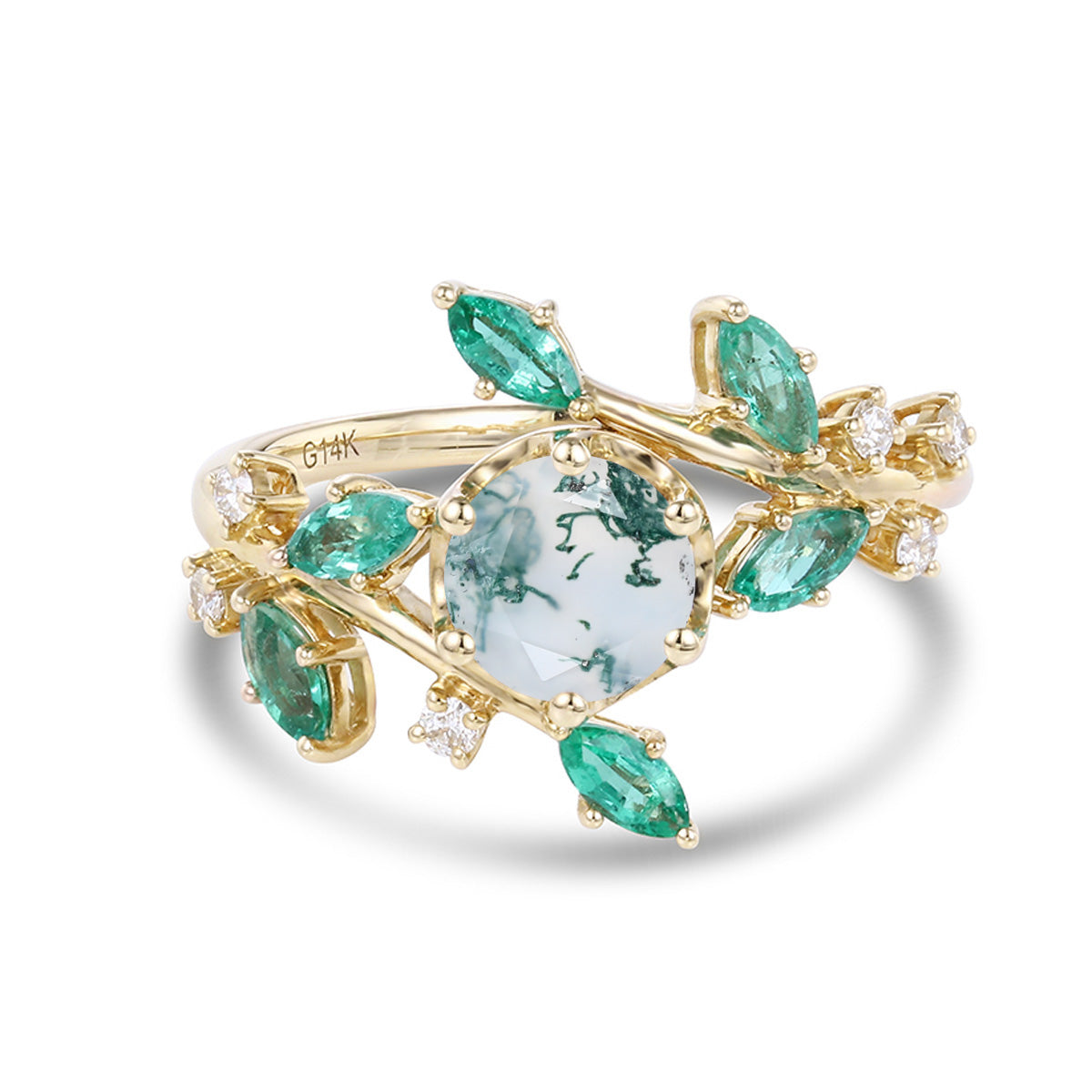 Nature Inspired Round cut Moss Agate cluster Gold Engagement Ring