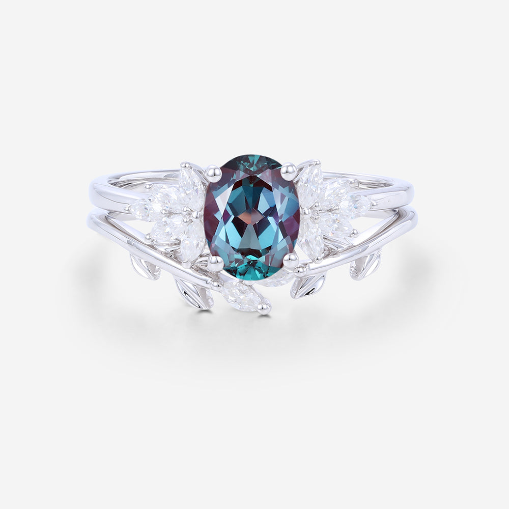 1.5Carat Oval Lab Alexandrite Cluster Engagement Ring Bridal Set
