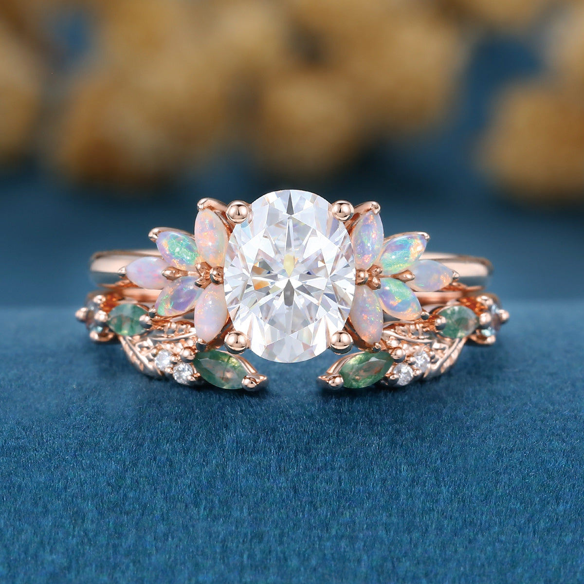 Oval cut Moissanite+ Opal Engagement ring Moss agate Wedding Bridal set