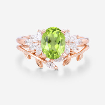 Oval cut Olivine Cluster Engagement ring Bridal Set