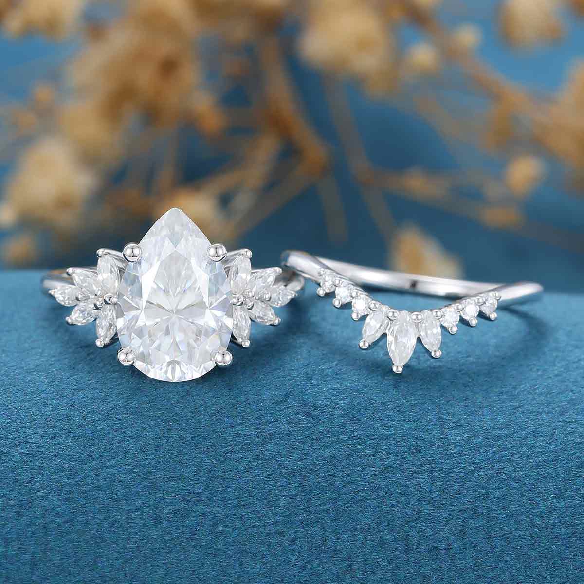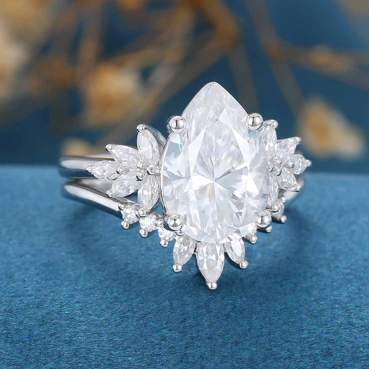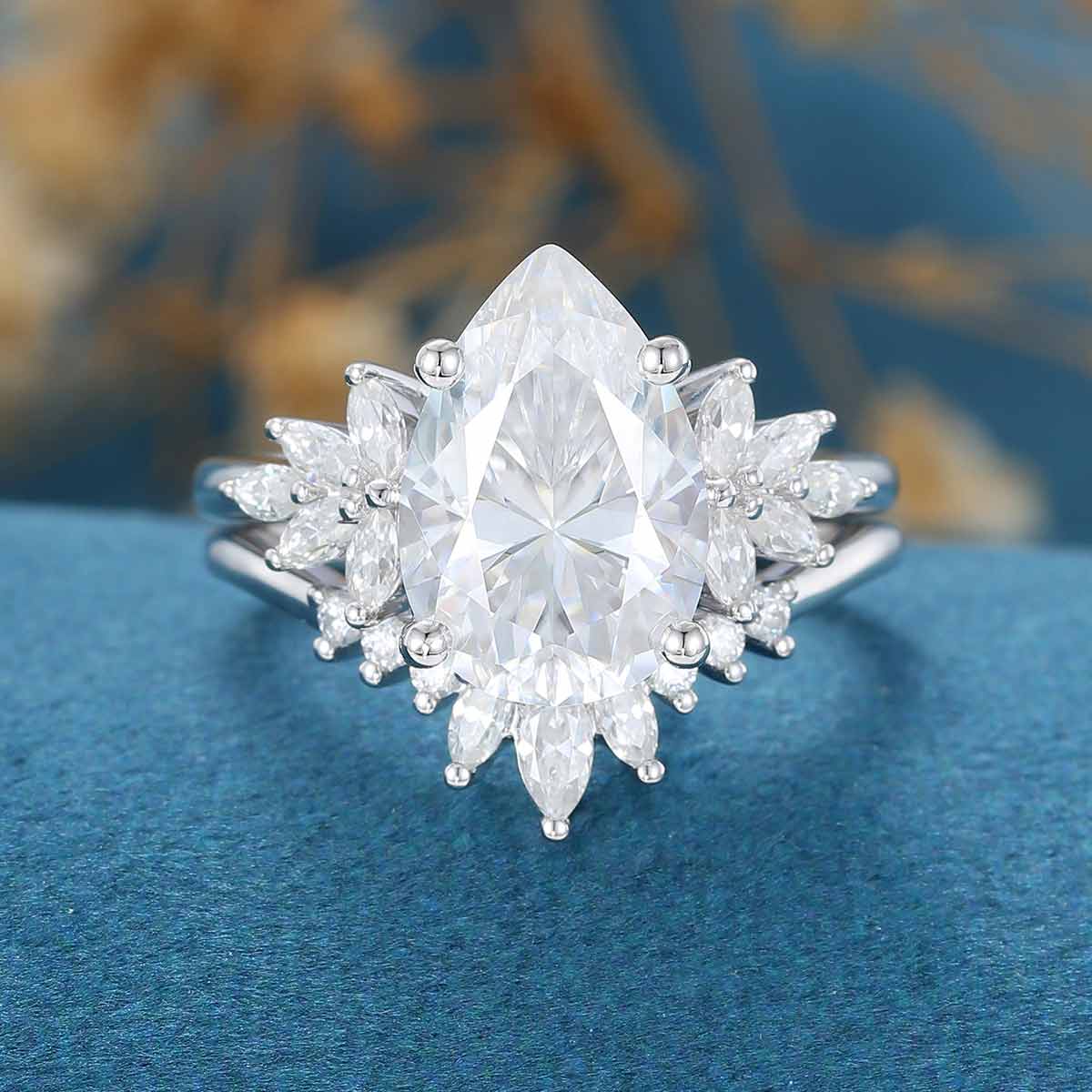 Pear cut Moissanite Cluster Engagement ring Bridal Set