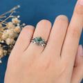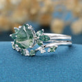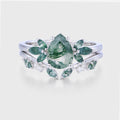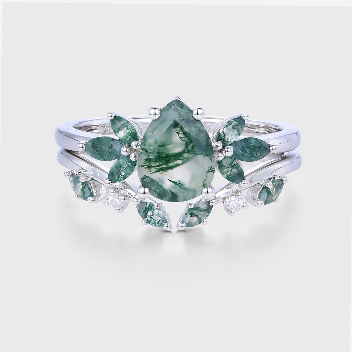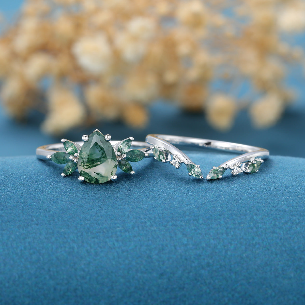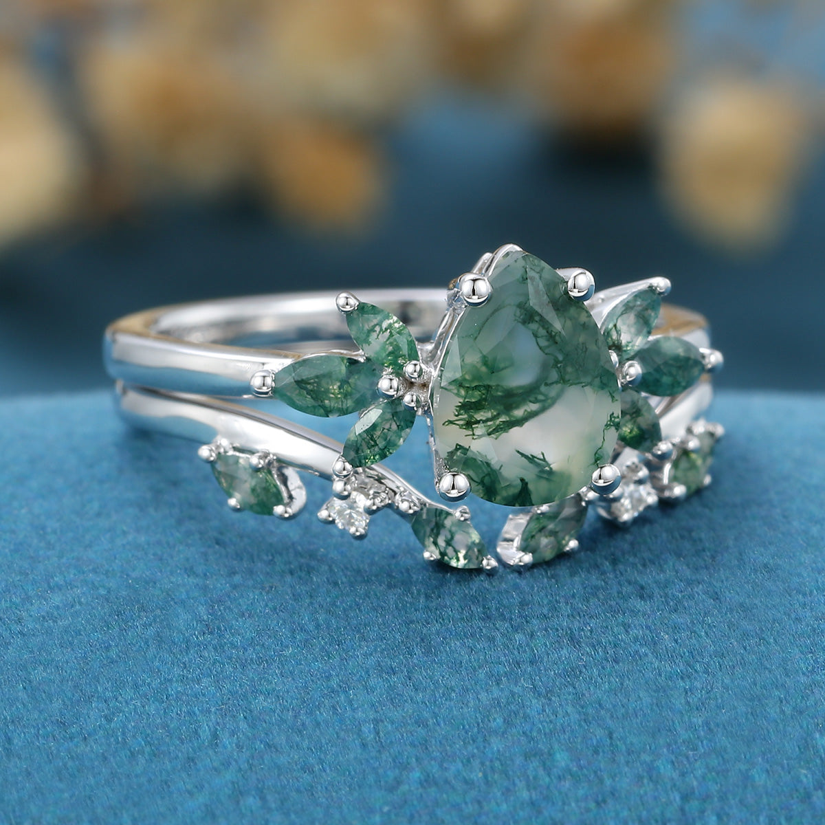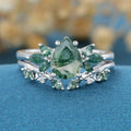 Pear cut Moss Agate Cluster Engagement ring Bridal Set