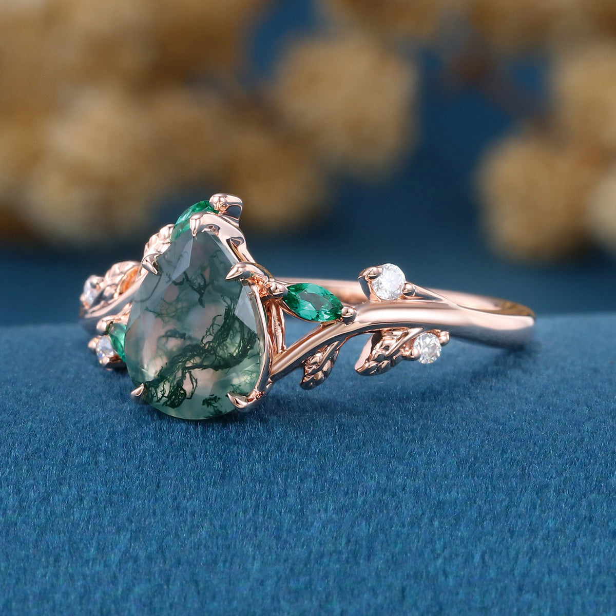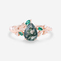 Pear cut Moss Agate + Lab Emerald Engagement Ring