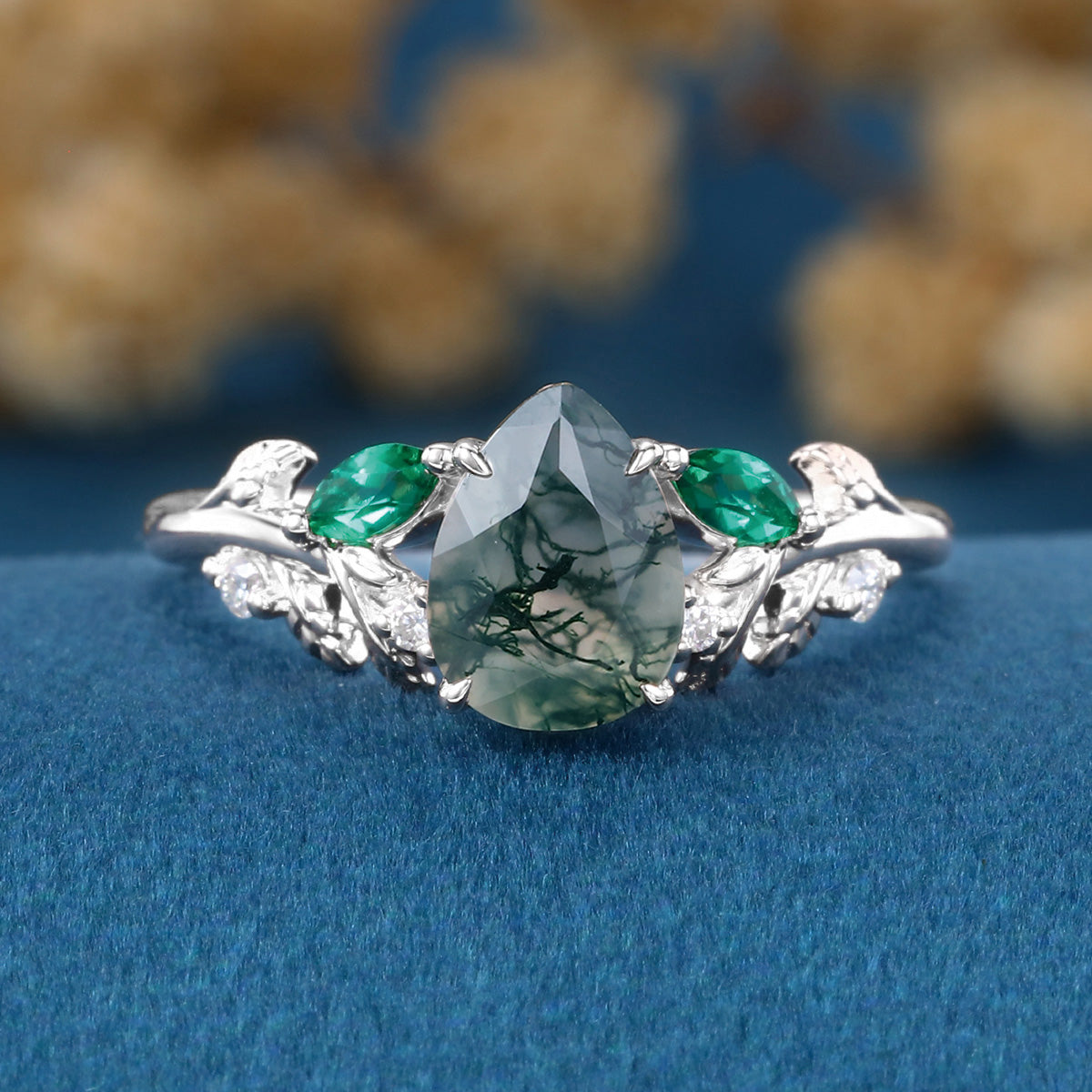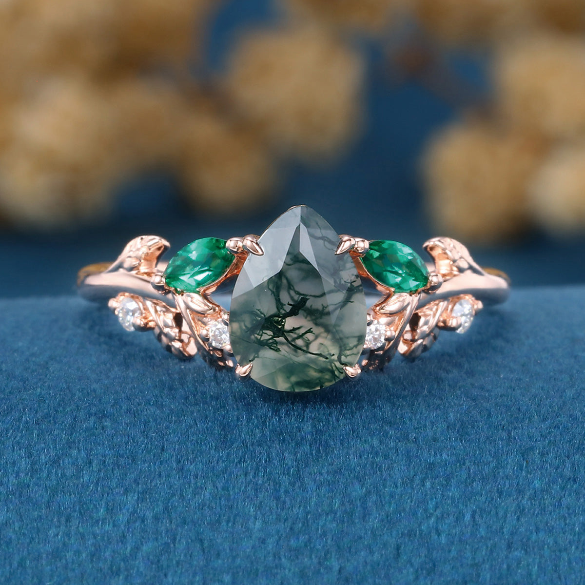Pear cut Moss Agate + Lab Emerald Engagement Ring