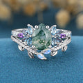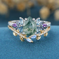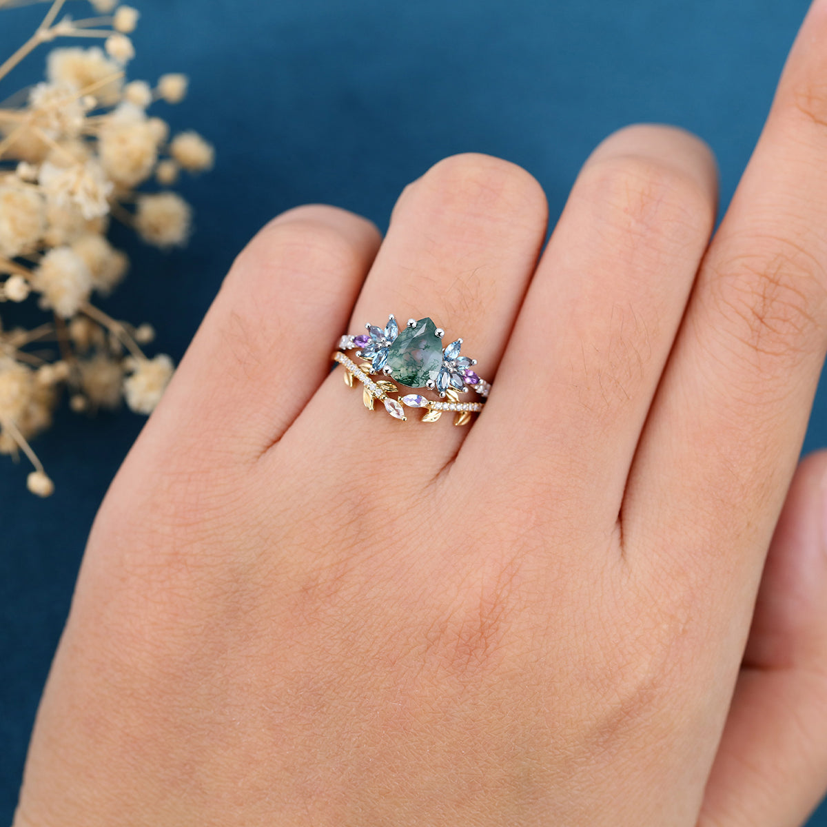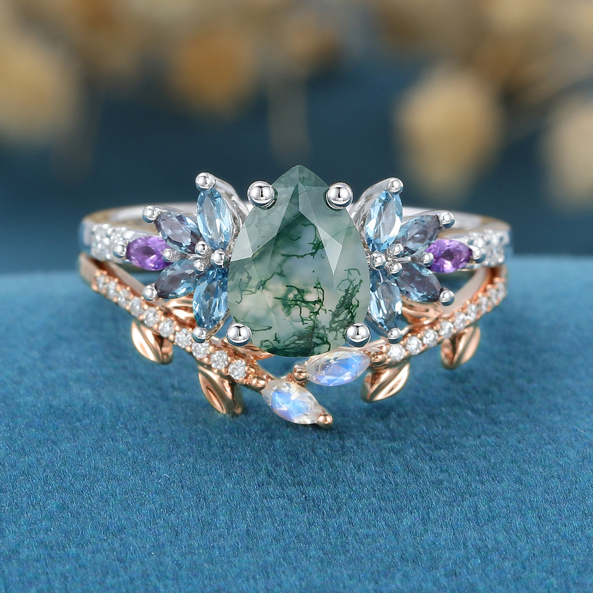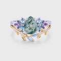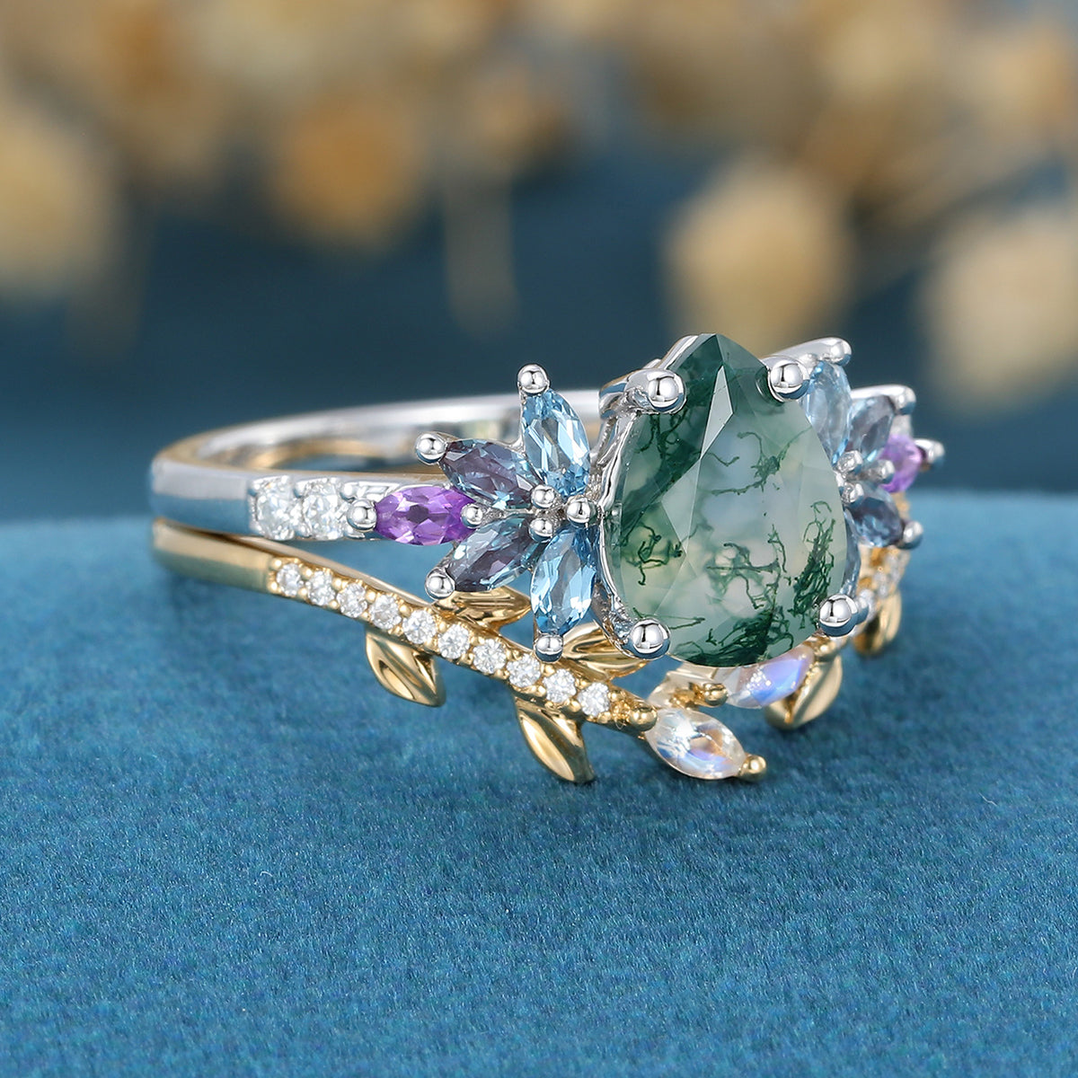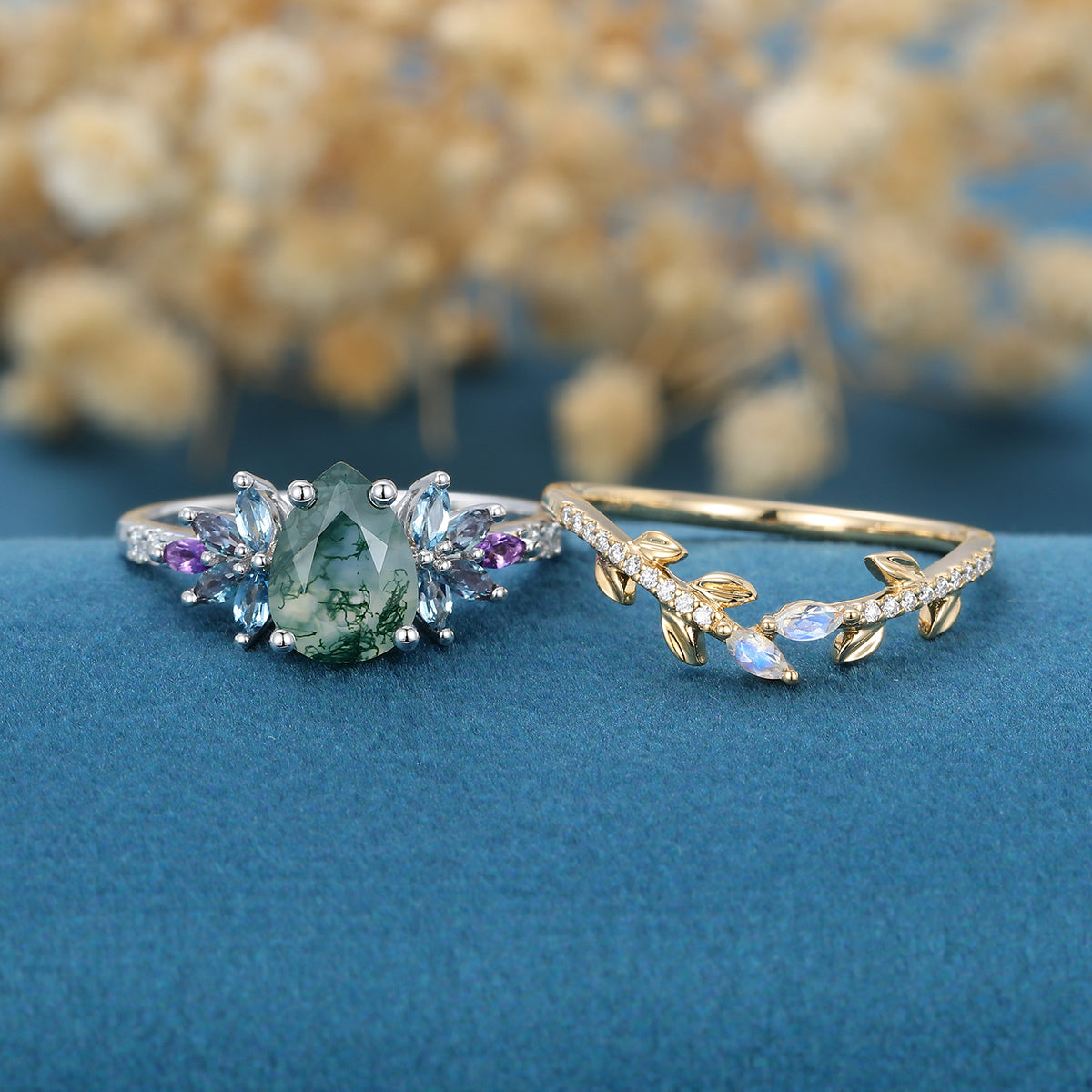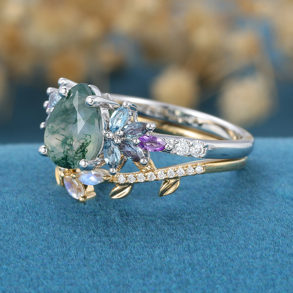 Pear Cut Moss Agate Solid Gold Wedding Bridal Set
