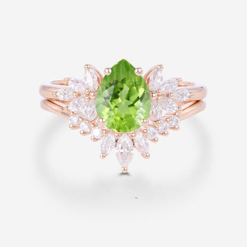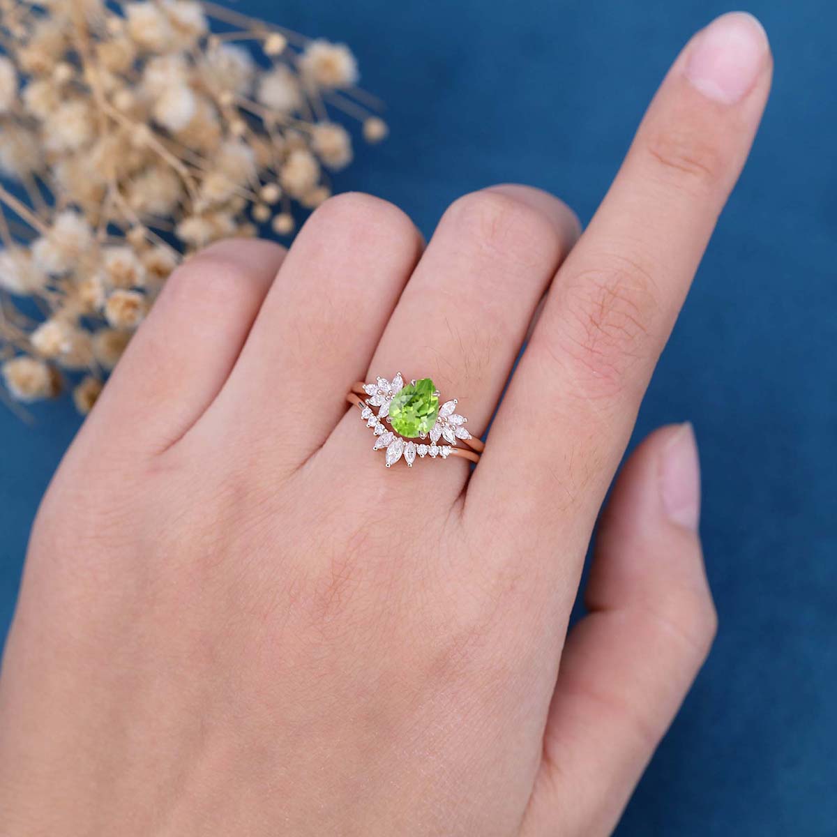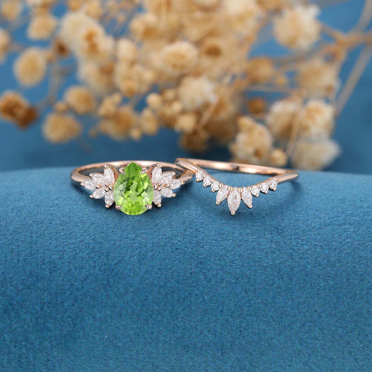 Pear cut Olivine Cluster Engagement ring Bridal Set