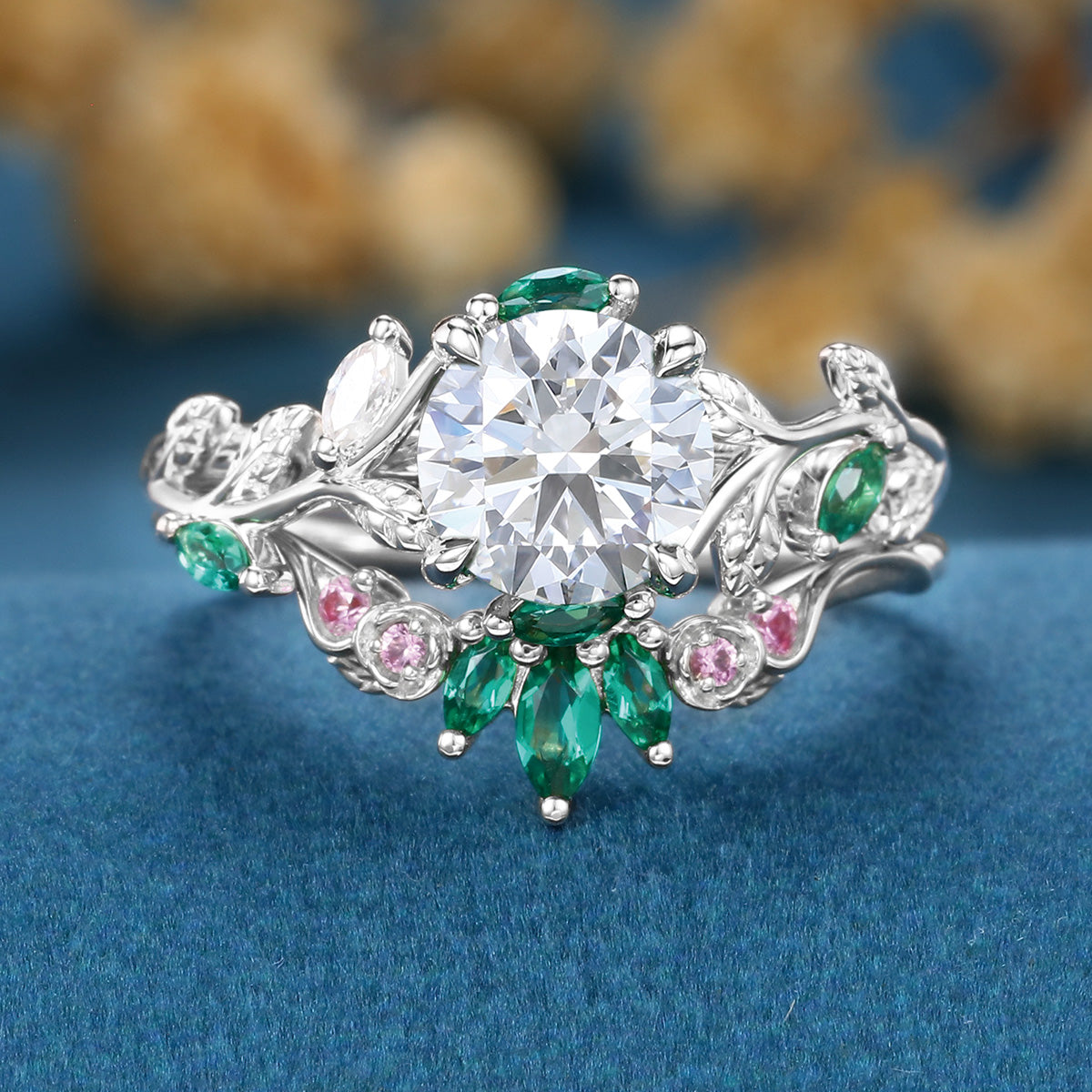 Round cut Moissanite + Pink Sapphire | Lab Emerald Curved Wedding bridal set