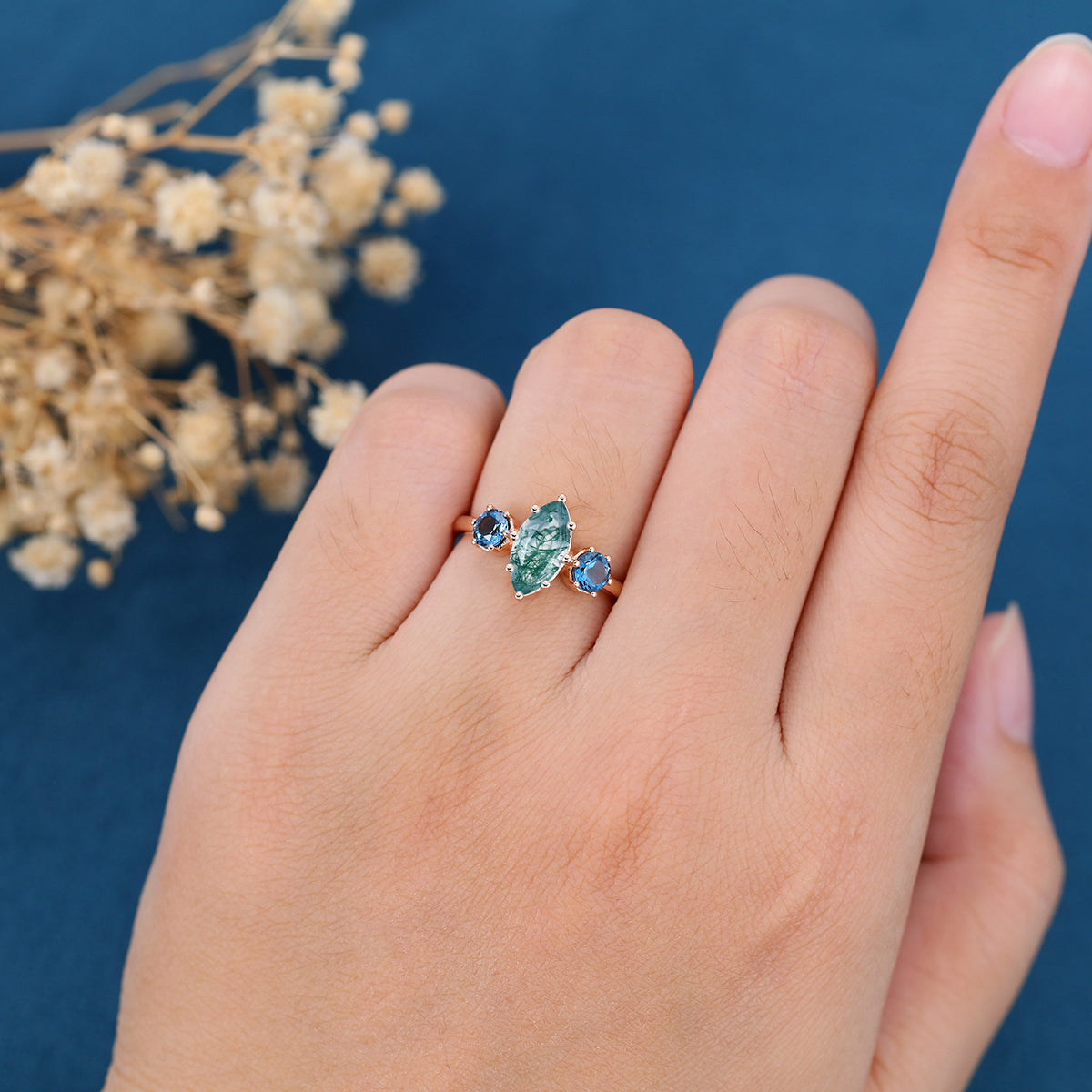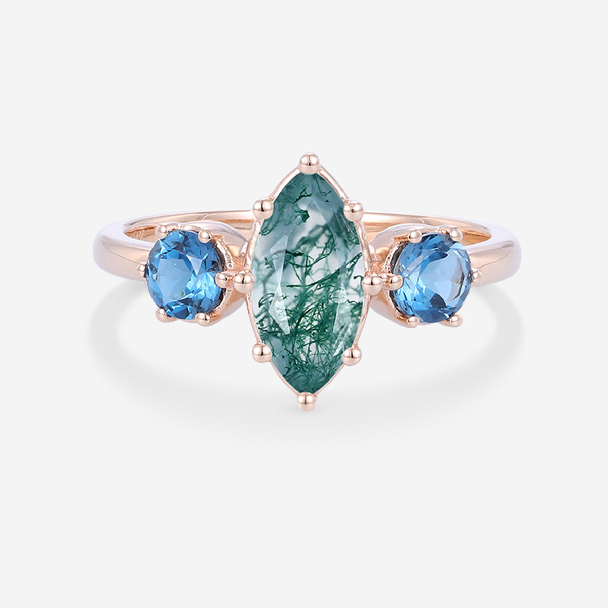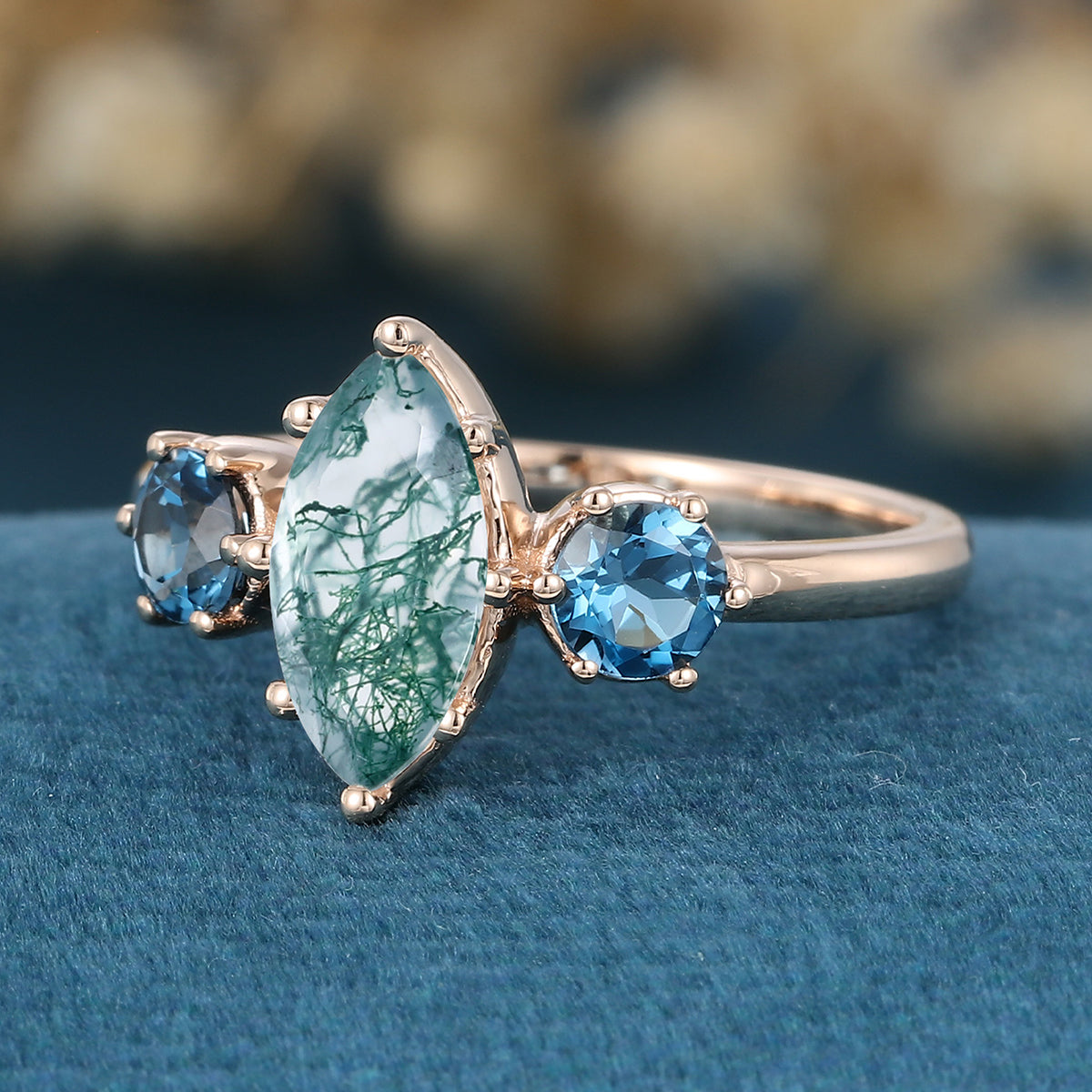 Marquise cut Moss Agate Matching London blue Topaz Gold Engagement Ring