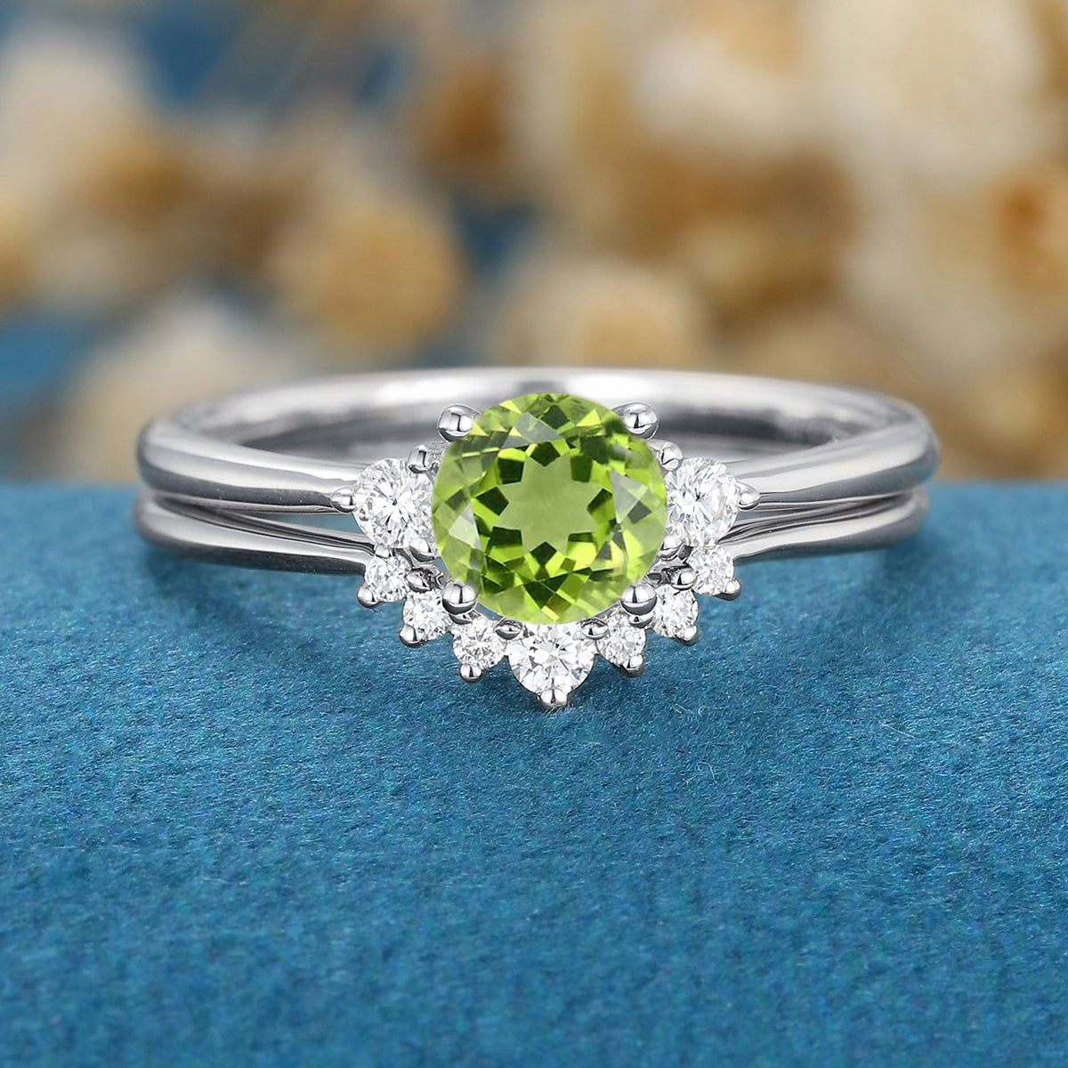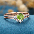 Round cut Olivine Cluster Engagement ring Bridal Set