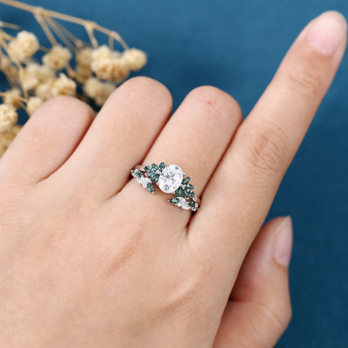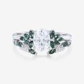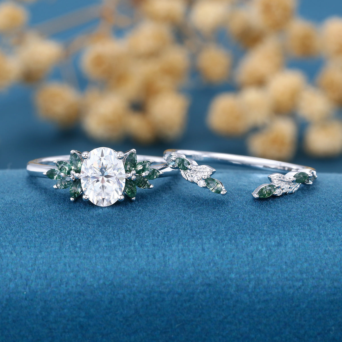 Vintage Oval cut Moissanite + Moss agate Wedding Bridal Set